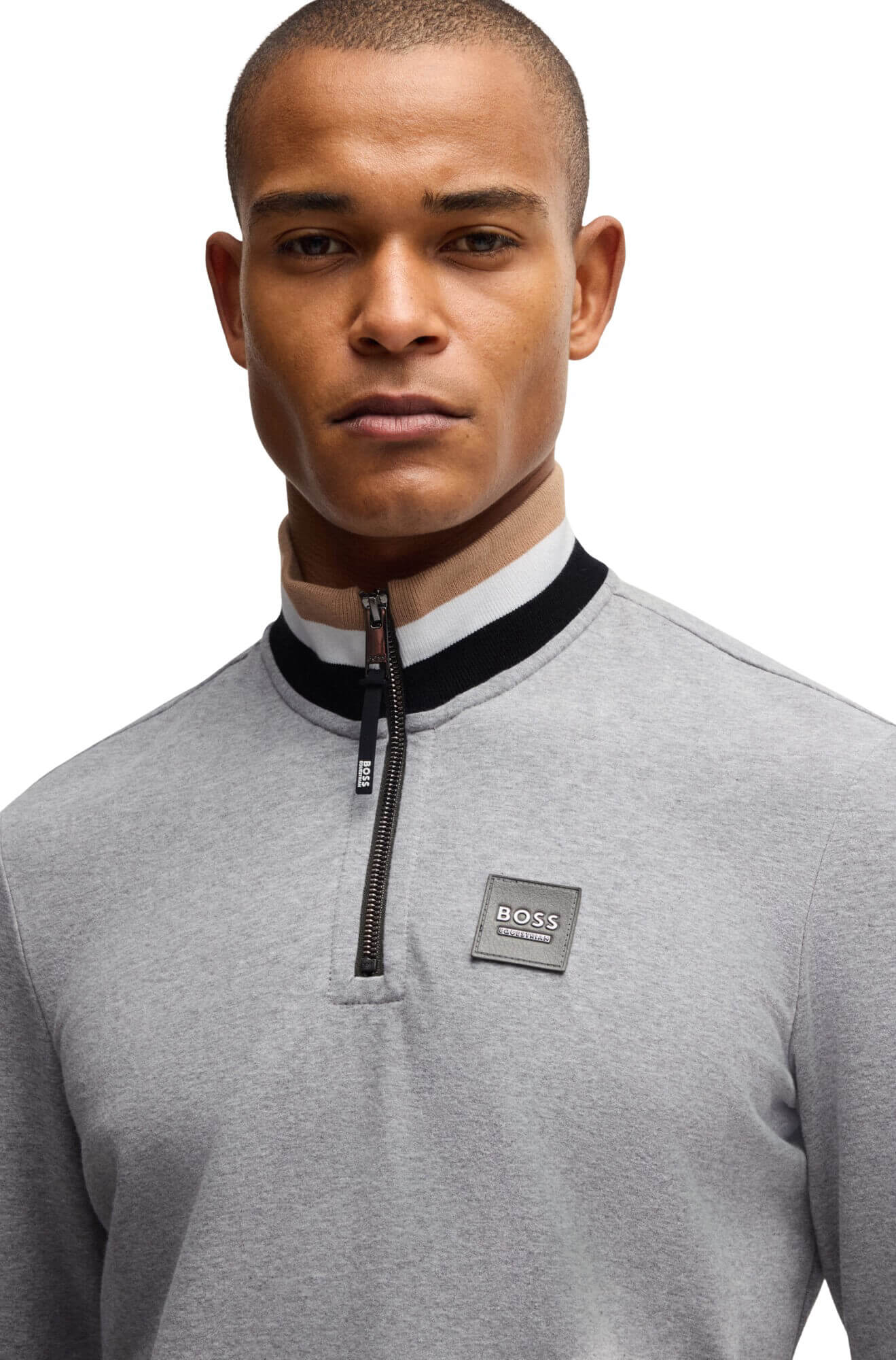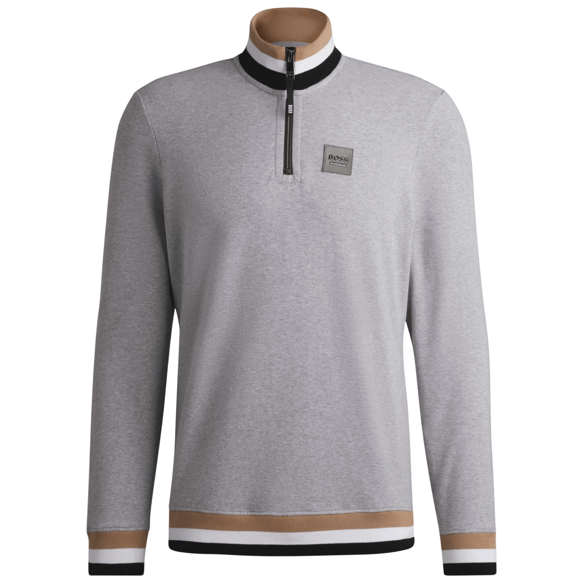 - straight-cut BOSS Troyer with signature colors on the stand-up collar and logo patch